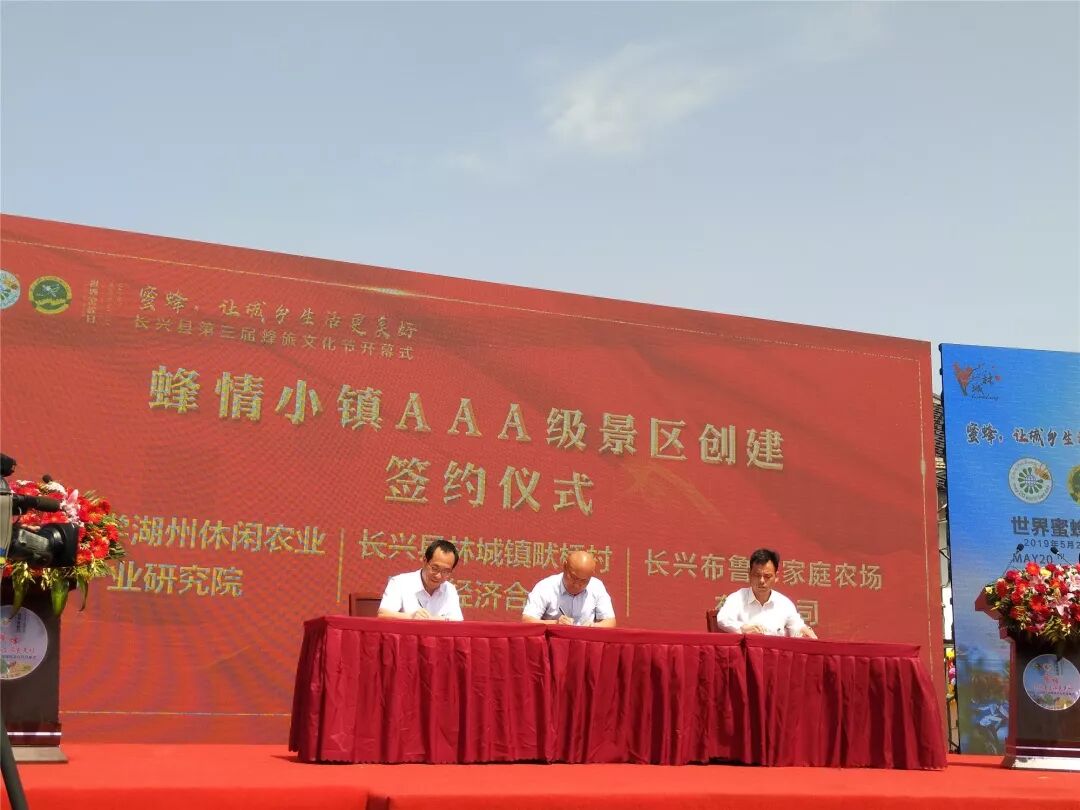 浙江大学湖州休闲农业产业研究院、长兴畎桥文旅公司、长兴布鲁克家庭农场三方共同签约“蜂情小镇”AAA景区创建。