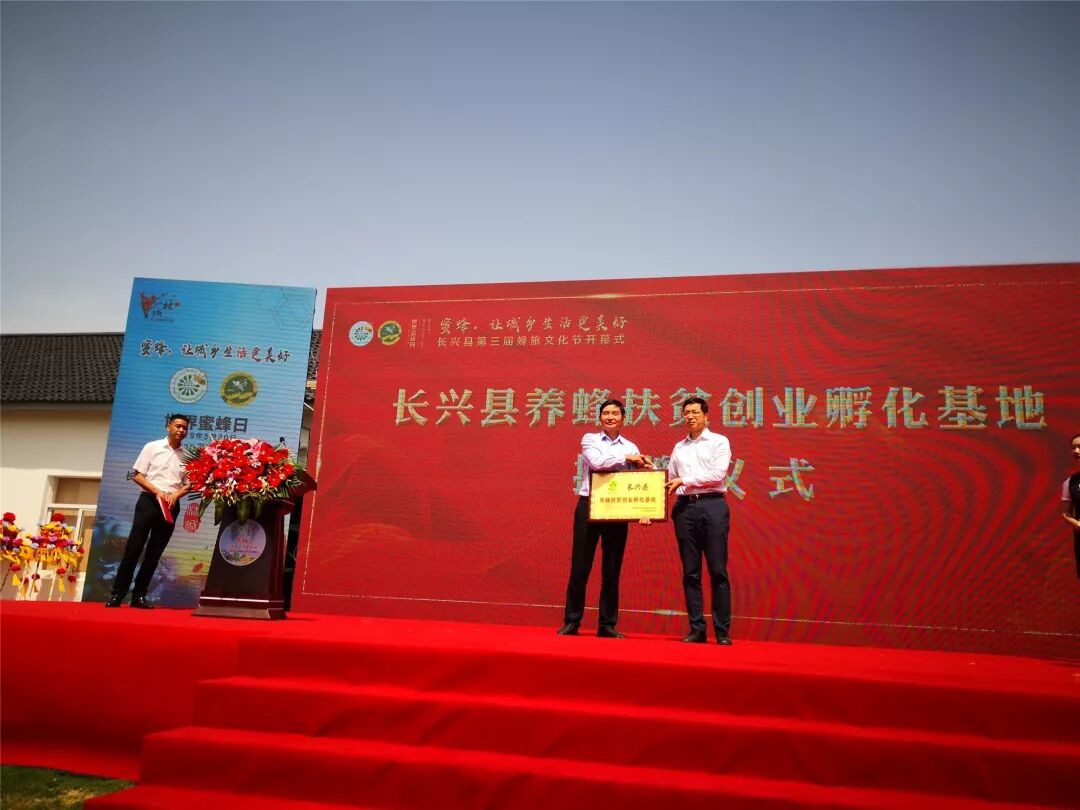 湖州市市农办主任、市农业农村局局长杨中校为养蜂扶贫创业孵化基地授牌。