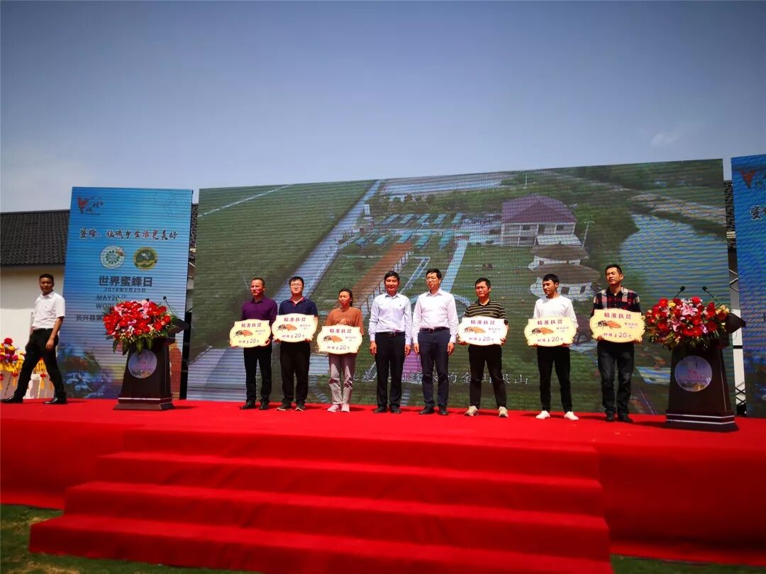 现场,长兴县养蜂扶贫创业孵化基地向来自安吉县、杨家埠街道和长兴县小浦、水口、林城镇6位养蜂扶贫户赠送种蜂王120只。