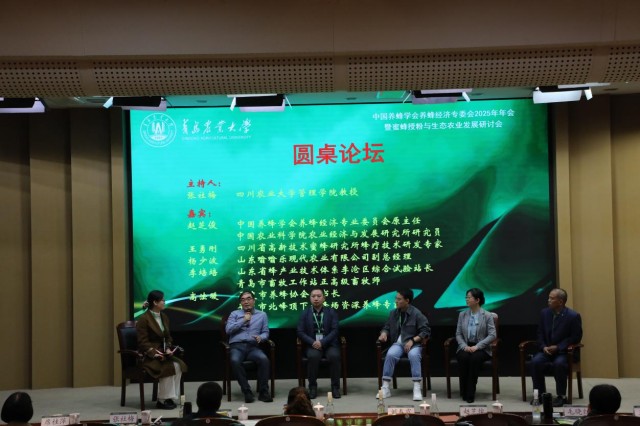 圆桌论坛汇聚业内专家学者与企业代表,围绕蜜蜂授粉与生态农业融合的核心议题深入研讨,为产业发展建言献策。中国养蜂学会养蜂经济专业委员会原主任、中国农业科学院研究员赵芝俊,四川省高新技术蜜蜂研究所蜂疗技术研发专家王勇刚,山东嗡嗡乐现代农业有限公司副总经理杨少波,山东省蜂产业体系试验站站长、青岛市畜牧工作站正高级畜牧师李培培,平度市养蜂协会秘书长、资深养蜂专家高法暖等嘉宾参与讨论,四川农业大学管理学院教授张社梅主持。