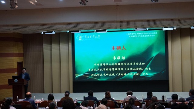 本次研讨会旨在践行生态优先、绿色发展理念,充分发挥蜜蜂授粉在提升作物品质、维护生物多样性、减少化学投入品使用等方面的生态功能,推动蜂产业与生态农业深度融合。中国养蜂学会秘书长褚艳娜,中国养蜂学会养蜂经济专业委员会原主任、中国农业科学院农业经济与发展研究所研究员赵芝俊,中国养蜂学会养蜂经济专业委员会副主任、福建农林大学蜂学与生物医药学院蜂学教授徐国钧,浙江省农业科学院农村发展研究所研究员毛晓红、四川农业大学管理学院教授张社梅、山东省蜂产业体系蜂授粉岗位专家、山东省农业科学院植物保护研究所副研究员陈浩、青岛市畜牧工作站党委成员、工会主席郑岩等来自17个单位的领导、专家学者共100余人参加了会议。青岛农业大学党委副书记刘春霞出席会议。会议由中国养蜂学会养蜂经济专业委员会主任、经济管理学院(合作社学院)院长、新农村发展研究院(乡村振兴研究院)院长李敬锁主持。