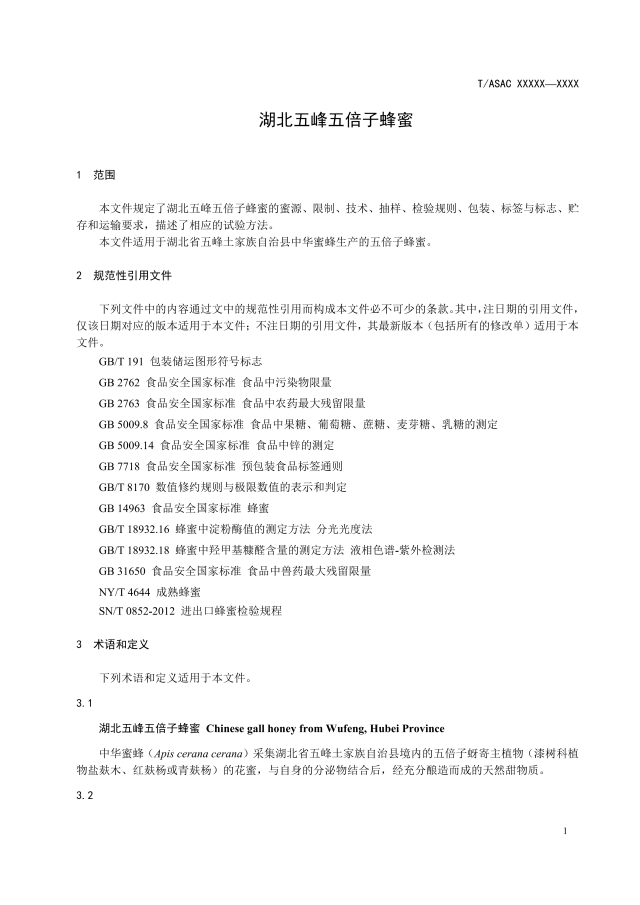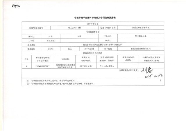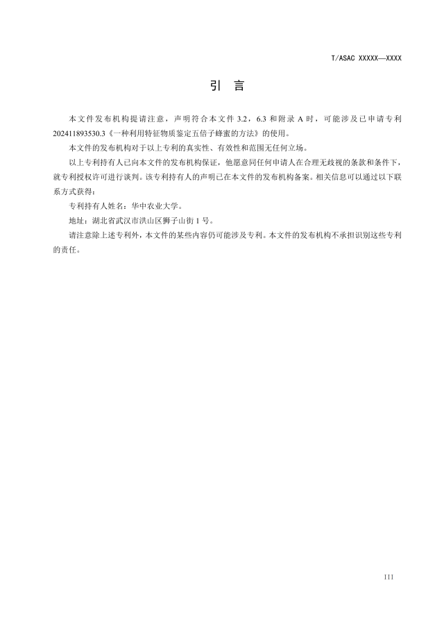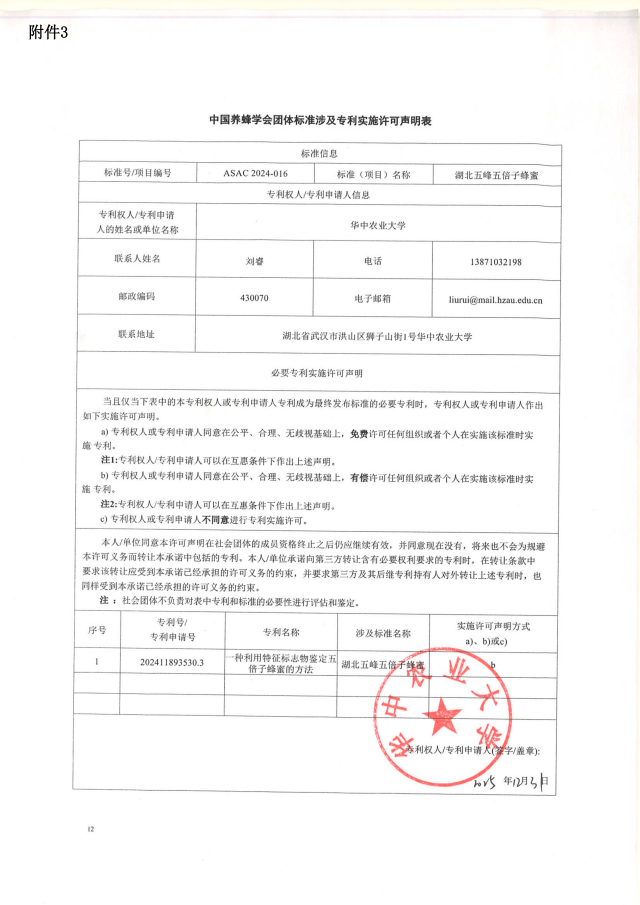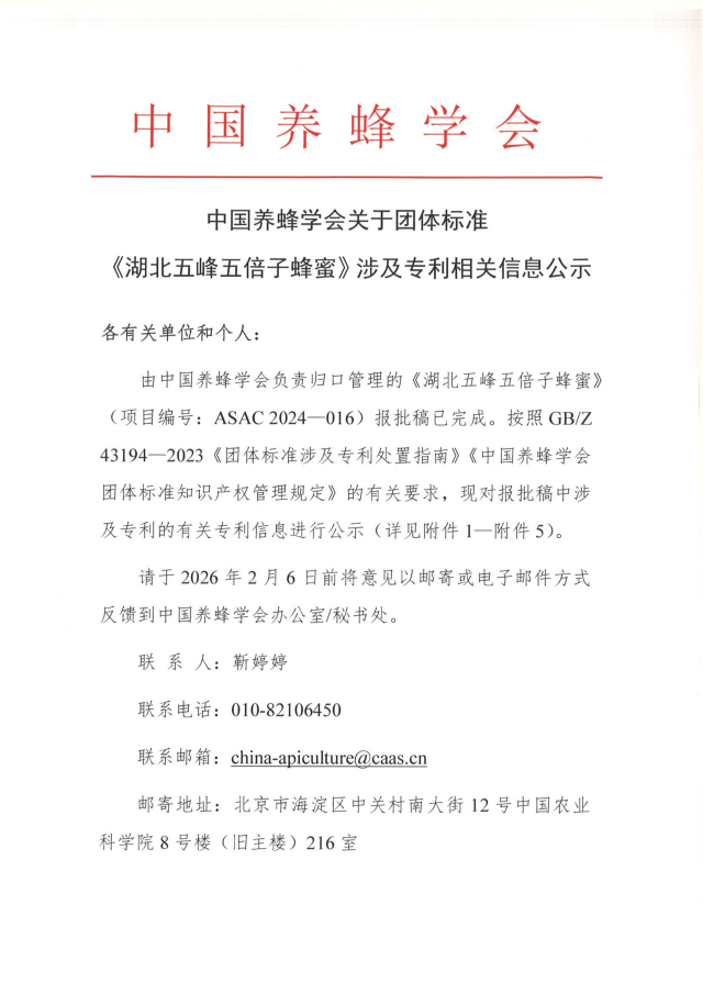 中国养蜂学会关于团体标准<<湖北五峰五倍子蜂蜜>>涉及专利相关信息公示