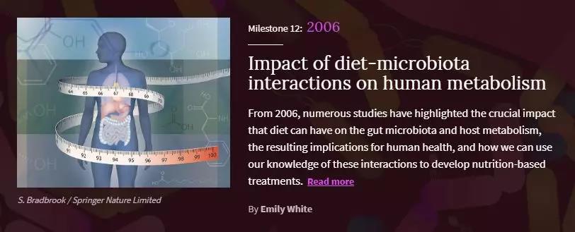 2019年6月,Nature Milestones 推出专刊,详解人类菌群研究历史上的25个重大里程碑。其内容极为详尽,时间跨度长达70余年,总结了相关领域的几乎一切重要研究。