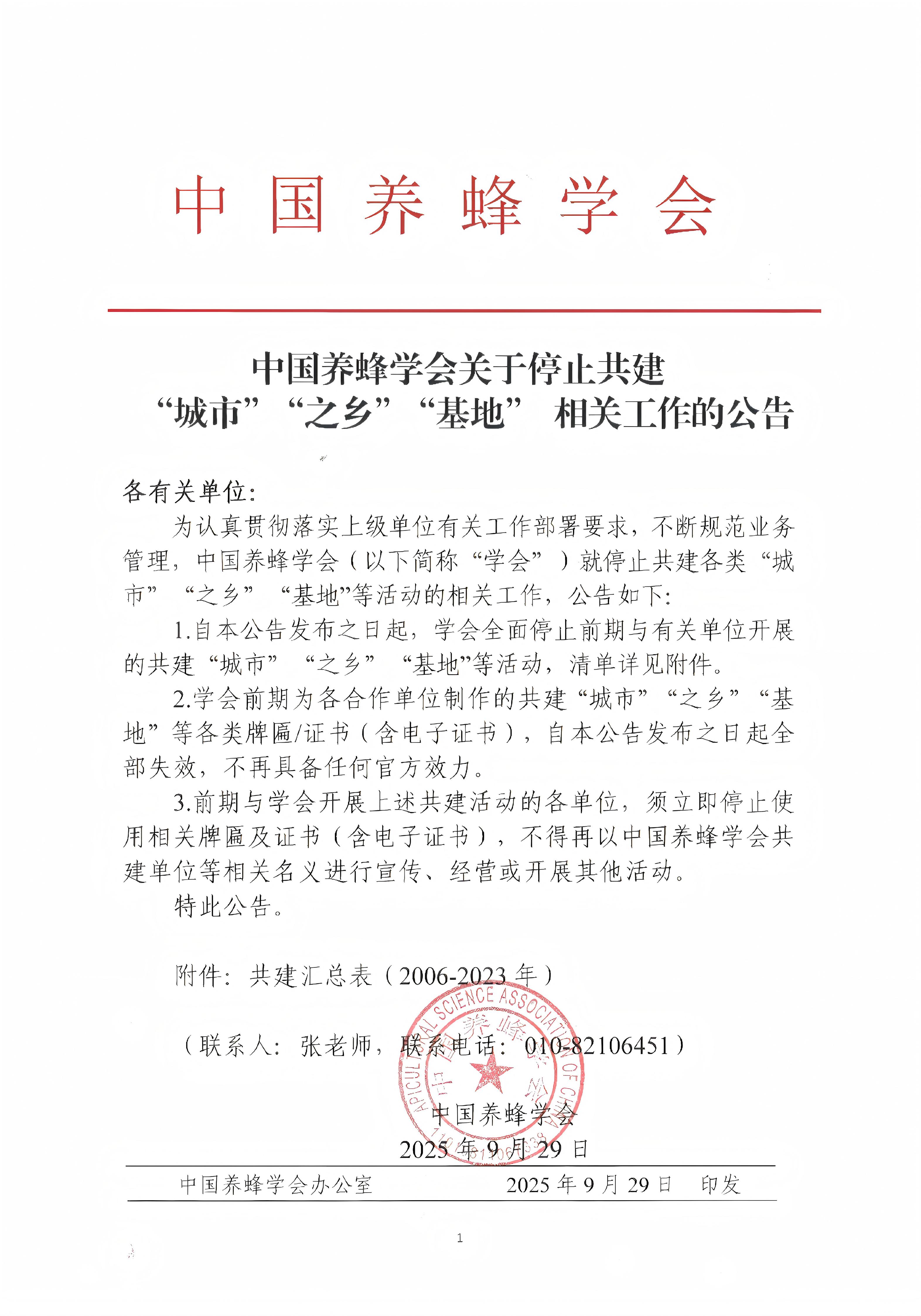 中国养蜂学会关于停止共建 “城市”“之乡”“基地” 相关工作的公告