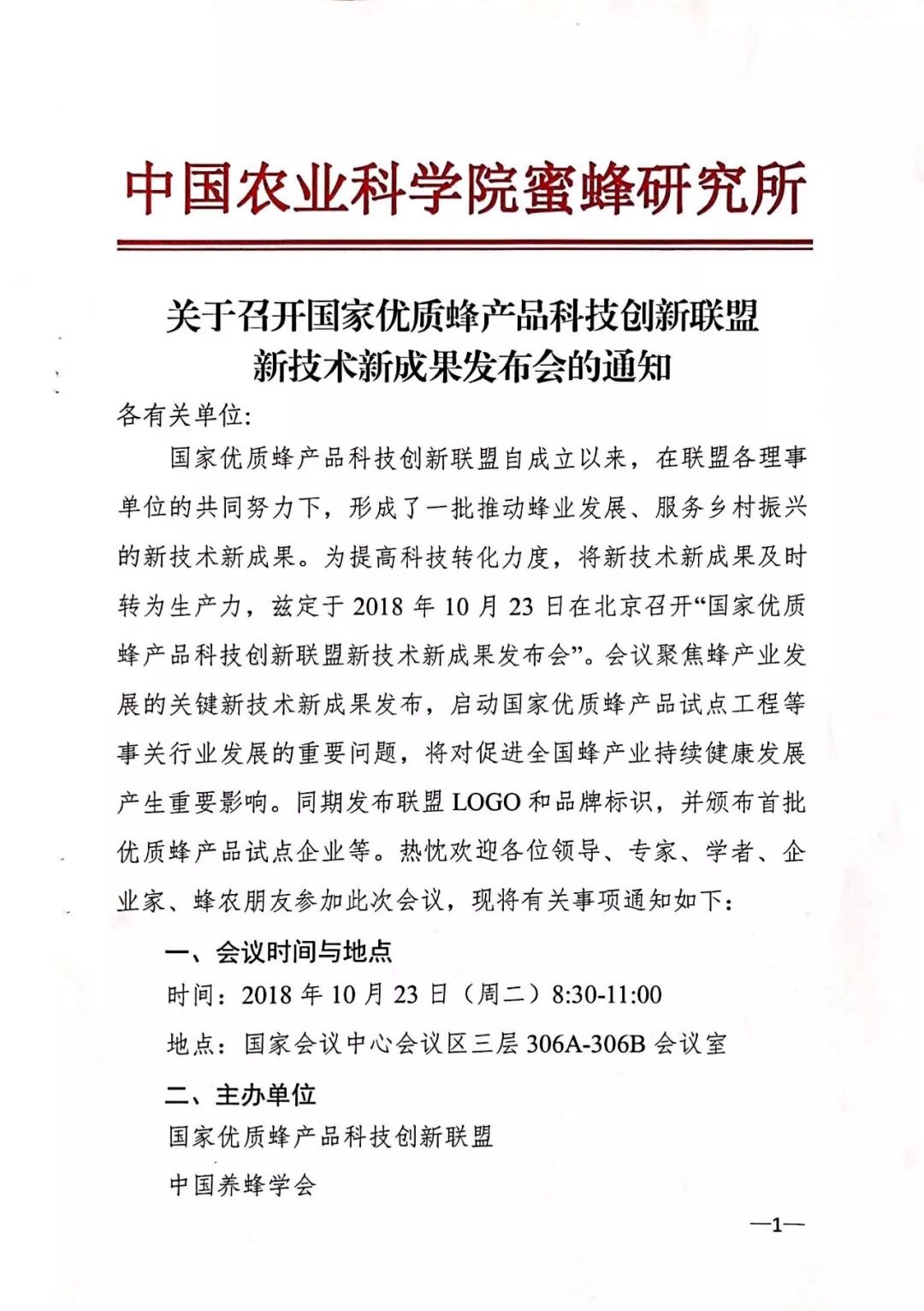 国家优质蜂产品科技创新联盟自成立以来,在联盟各理事单位的共同努力下,形成了一批推动蜂业发展、服务乡村振兴的新技术新成果。为提高科技转化力度,将新技术新成果及时转为生产力,兹定于2018年10月23日在北京召开“国家优质蜂产品科技创新联盟新技术新成果发布会”。会议聚焦蜂产业发展的关键新技术新成果发布,启动国家优质蜂产品试点工程等事关行业发展的重要问题,将对促进全国蜂产业持续健康发展产生重要影响。同期发布联盟LOGO和品牌标识,并颁布首批优质蜂产品试点企业等。热忱欢迎各位领导、专家、学者、企业家、蜂农朋友参加此次会议,现将有关事项通知如下: